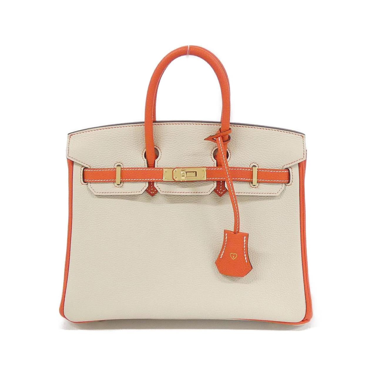エルメスのバーキン25です。ベトンとオレンジフィールドの配色が素敵で、パーマブラス金具との組み合わせも上品です。 仕事が忙しくなって出かける機会が減ったので、新しいオーナーさんに使ってもらおうと思って出品します。購入してから数回しか使ってないので、まだまだ綺麗な状態です。細かい擦れや黒ずみはありますが、目立つ傷はありません。 トゴレザーは丈夫で扱いやすいので、これからも長く愛用できると思います。カデナと鍵、クロシェット、保存袋、箱も全部付いてますので、すぐに使い始められますよ。パーソナルオーダー品で刻印も入ってます。 何か質問があればお気軽にどうぞ。