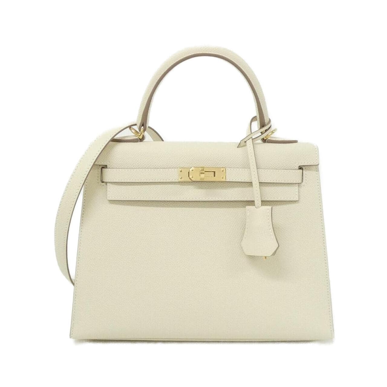 エルメスのケリー25を出品します。 買取で入手した未使用品です。保管していたのですが、使う機会がなさそうなので手放すことにしました。 クレという淡いホワイトカラーで、ゴールド金具の組み合わせがとても上品です。エプソン素材なので傷も汚れもなく、本当に綺麗な状態です。 カデナや鍵、ストラップ、保存袋、箱もすべて揃っています。K刻印なので比較的新しいモデルです。サイズは25cmで使いやすいサイズだと思います。 返品はできませんのでご了承ください。何か質問があればお気軽にお問い合わせください。